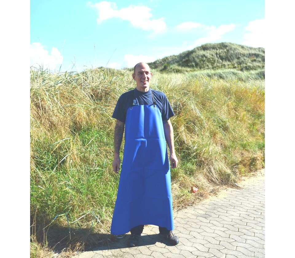 Our blue Frydendahl apron are produced in PVC.
