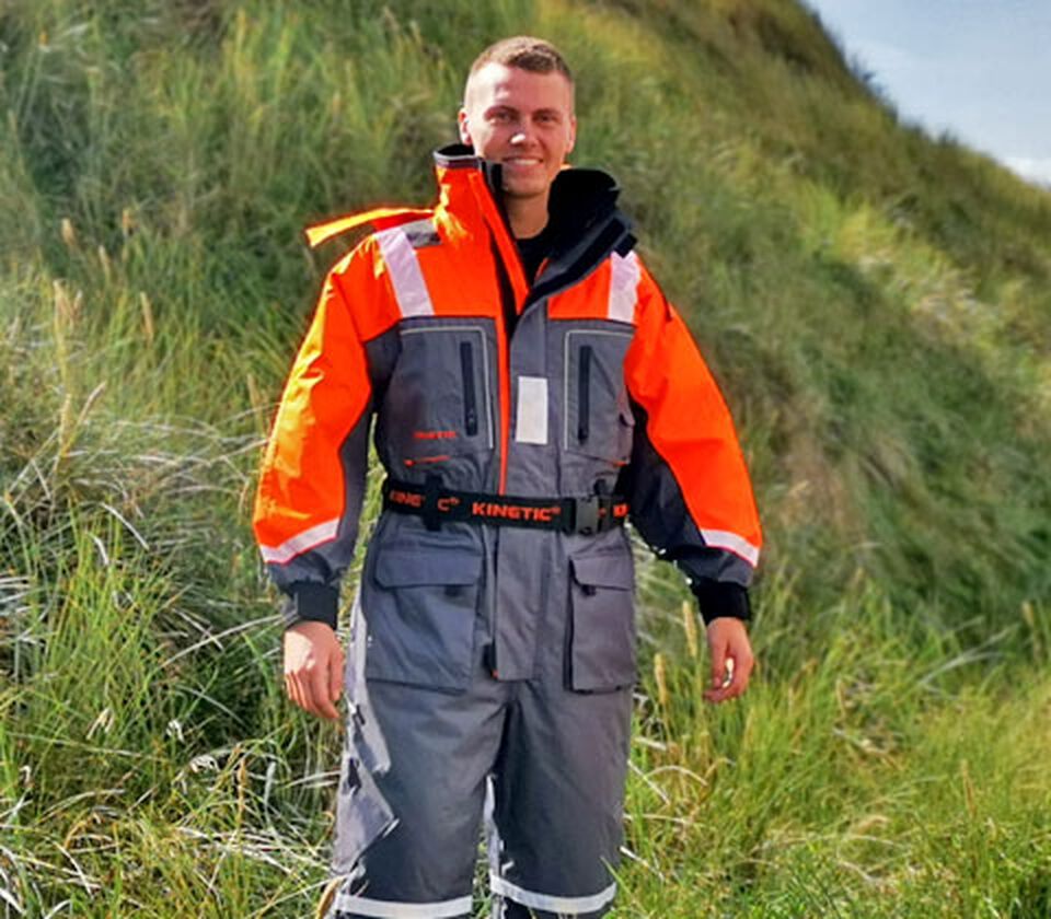 Immersion suit, CE-approved 50 N waterproof suit with buoyancy foam and a hood hidden in the collar.